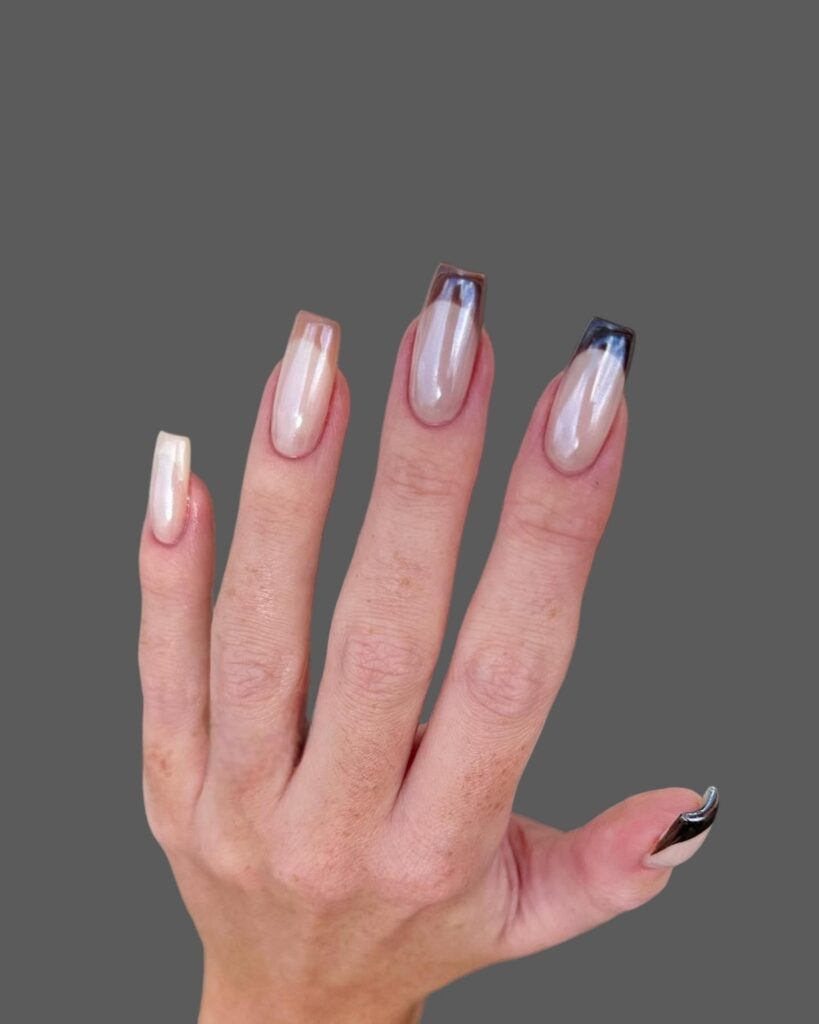 The finished French tip manicure is dusted with a fine, translucent chrome nails or ‘glazed donut’ powder for a pearlescent, shiny finish.