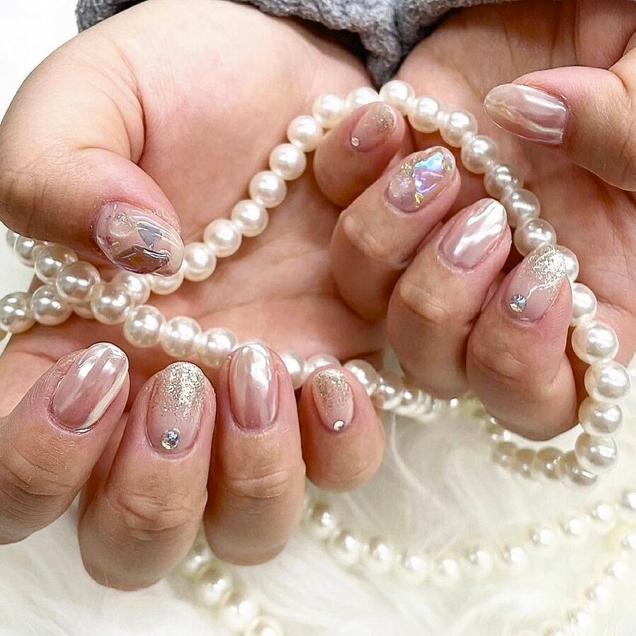 These elegant pearl-inspired, glass nails combine a glossy, shell-like sheen with soft nude tones, delicate gold glitter, and tiny crystal embellishments.