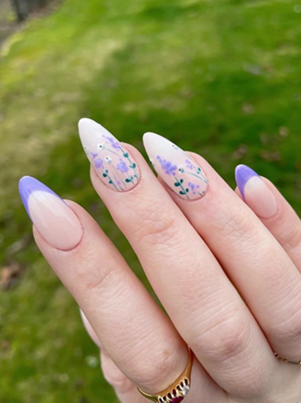 These lavender garden-inspired nails blend soft purple French tips with delicate hand-painted florals for the prettiest springtime vibe. The mix of clean nude bases, lilac accents, and tiny lavender flowers creates a dreamy, feminine manicure that feels fresh, elegant, and perfect for anyone who loves botanical nail art.