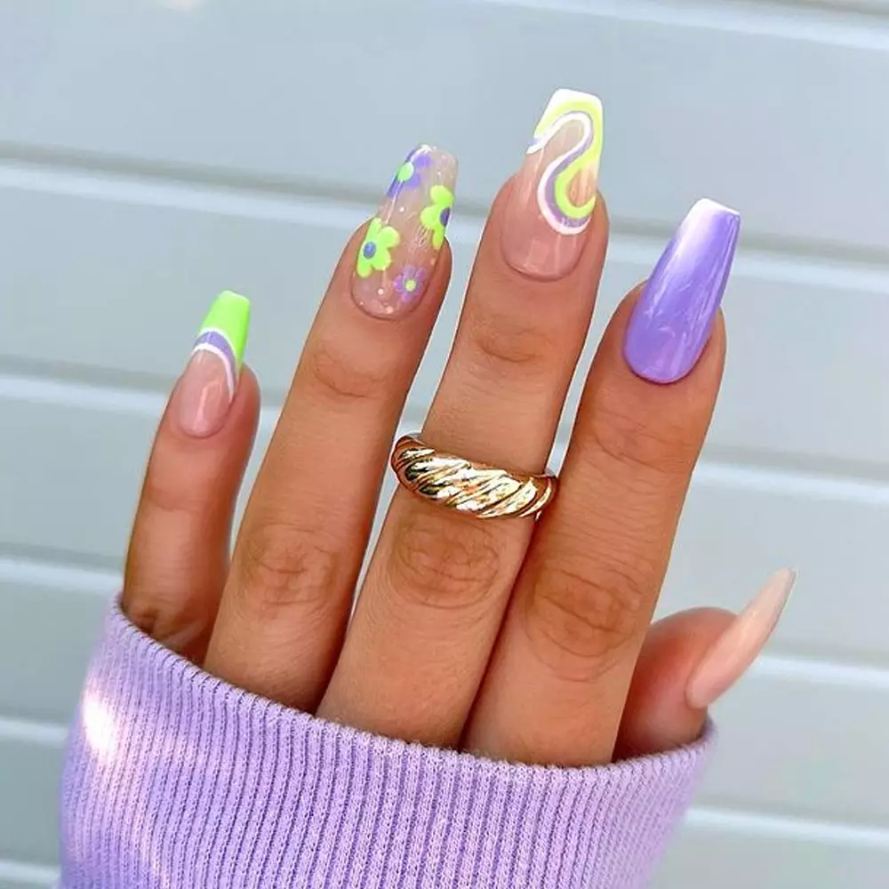 This vibrant manicure mixes playful lavender with neon green and soft nude tones for a fun, eye-catching look. Each nail has its own moment—lavender chrome shine, neon French tips, bright floral accents, and bold swirl art. The cozy lavender sweater in the shot ties the whole look together beautifully.