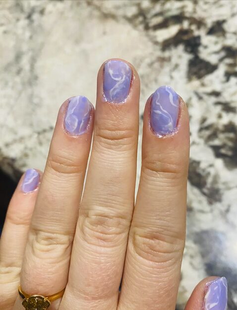 These lavender marble nails bring a dreamy, artistic vibe with their swirled purple tips and delicate gold foil accents. The nude base keeps the look soft and elegant, while the textured marble effect adds a touch of luxury.