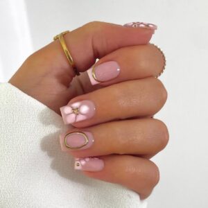 A soft pink base with delicate gold foil or glitter adds a touch of luxury and sophistication.